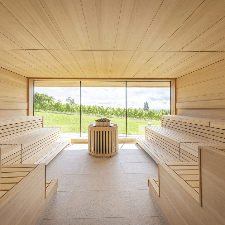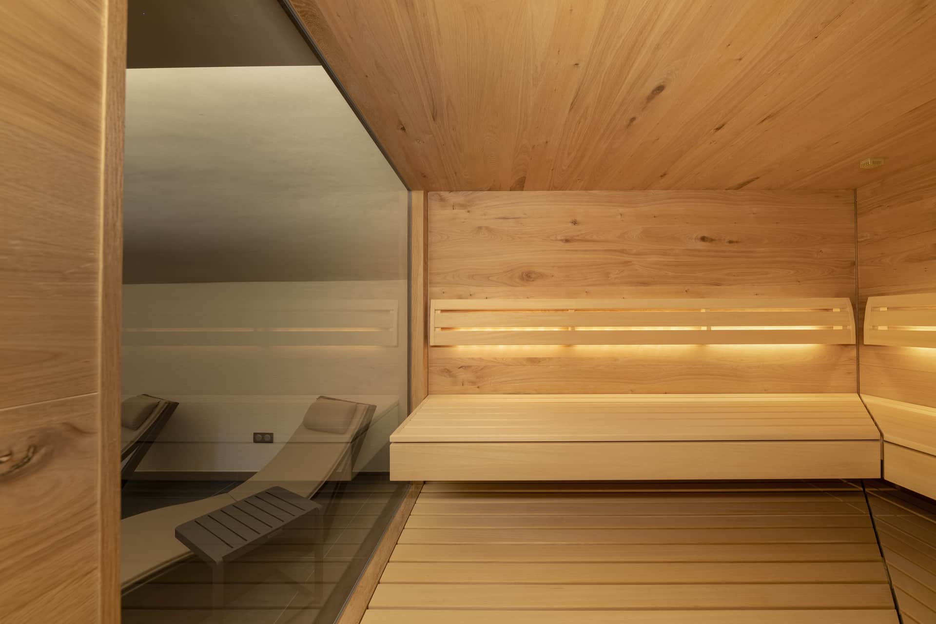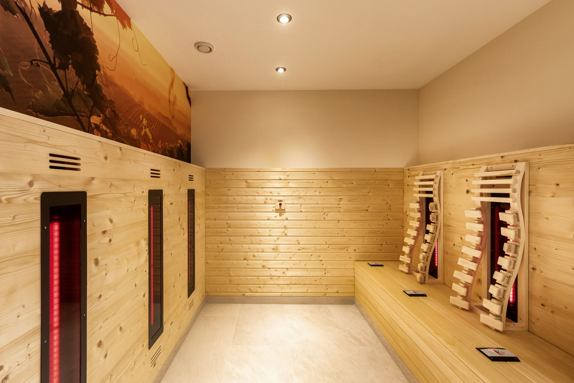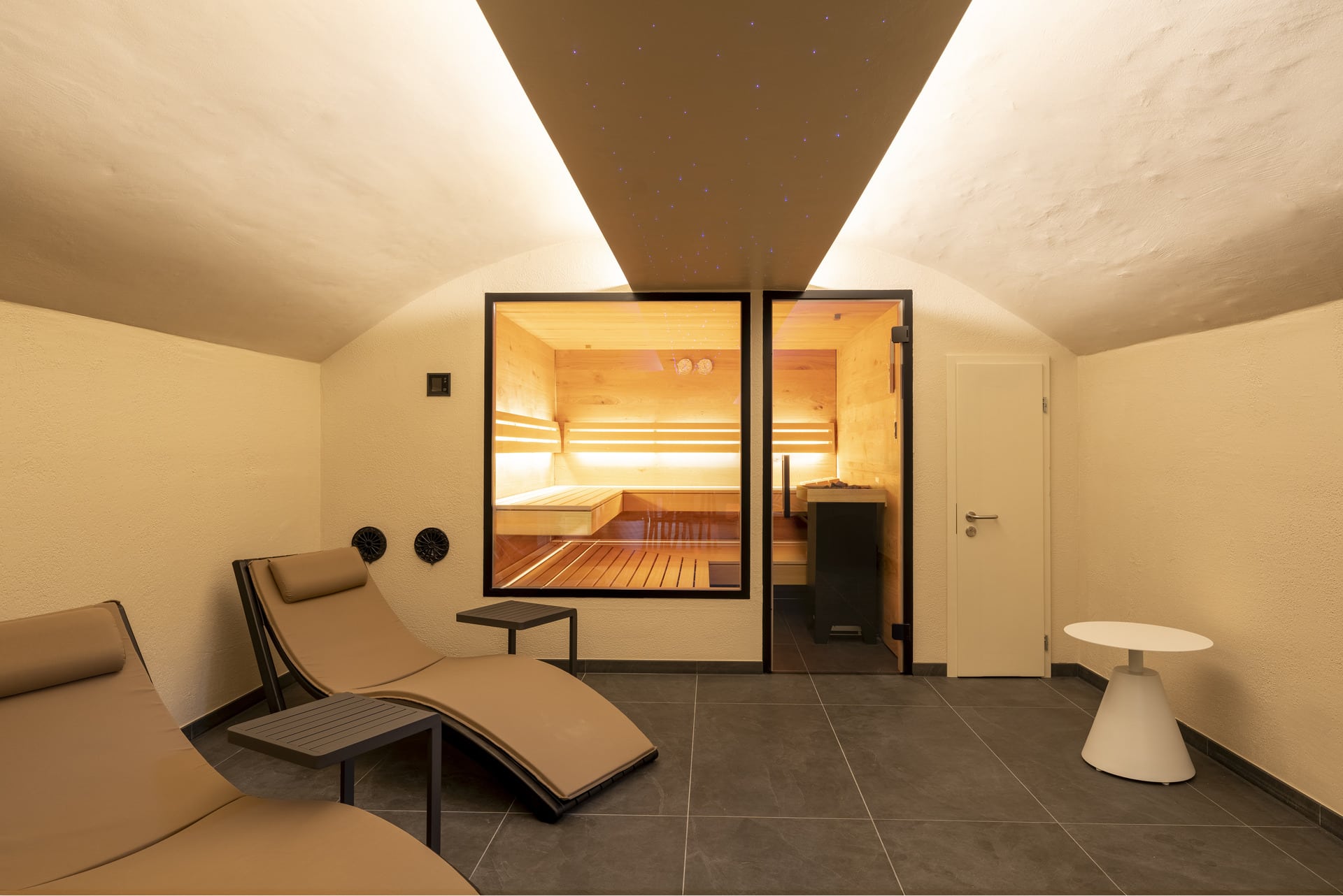 Im wunderschönen Elsass wurde das elegante Herrenhaus aufwändig umgebaut und mit einem Wellnessraum ausgestattet. Im Gewölbekeller des aus dem Jahre 1875 stammenden Hauses befindet sich der Saunabereich. Die finnische Sauna, eine Infrarotsitzbank sowie Dusch- und Ruhemöglichkeiten runden ein tolles Wellnessangebot ab. Großflächige Eicheplatten und eine indirekte Beleuchtung verleihen der Sauna eine außergewöhnliche Eleganz und lädt die Hotelgäste zum Entspannen und Verweilen ein.